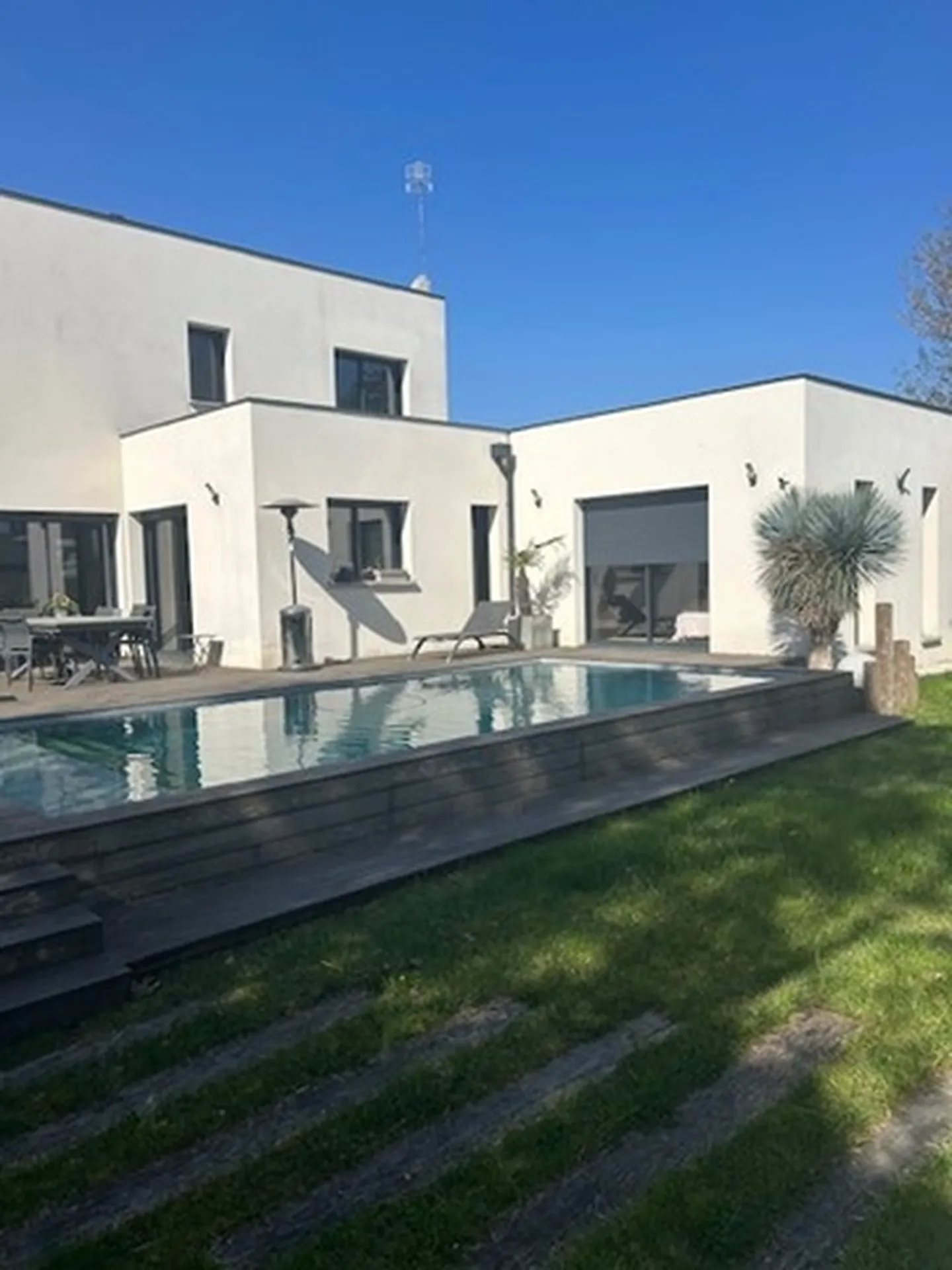 Choisir SB Constructions pour votre maison individuelle, c'est accéder à des finitions soignées. L'intérieur se distingue par des sols en travertin et en bois contrecollé, ainsi qu'une cuisine moderne avec éclairage LED encastré. La villa est équipée de menuiseries en aluminium Gris Anthracite (RAL 7016) avec baies à galandage monumentales de 4 mètres et d'une domotique centralisée via smartphone. À l'extérieur, nous avons réalisé une piscine maçonnée de 8,00 x 4,00 mètres avec liner et mur filtrant, entourée d'une plage en carrelage imitation bois.